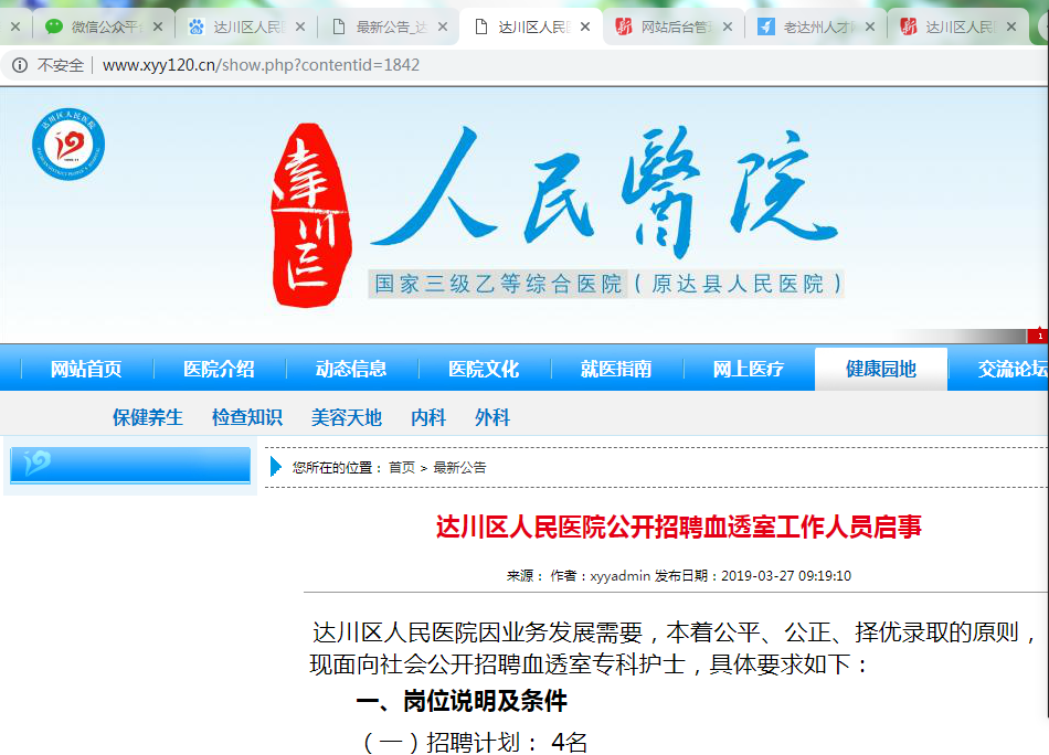 達川區(qū)人民醫(yī)院因業(yè)務(wù)發(fā)展需要,本著公平、公正、擇優(yōu)錄取的原則,現(xiàn)面向社會公開招聘血透室專科護士,具體要求如下: